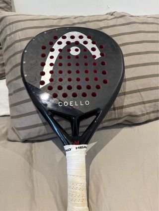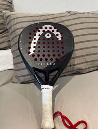 Pala de pádel Head Coello Pro en color negro con detalles en rojo. - Diseño con el logo de Head. - Nombre COELLO visible en la cara. - Cordón de seguridad rojo.