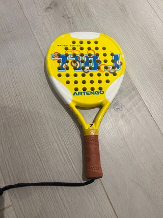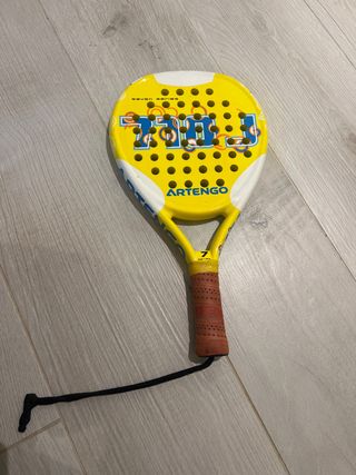 Pala de pádel Artengo en color amarillo y blanco. Ideal para iniciarse en el deporte. - Diseño llamativo. - Empuñadura cómoda. - Incluye cordón de seguridad.