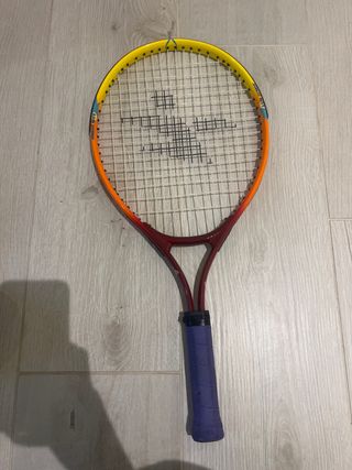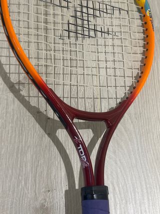 Pala de tenis con un diseño llamativo y moderno. - Marco de color degradado, de rojo a amarillo. - Empuñadura de color morado.