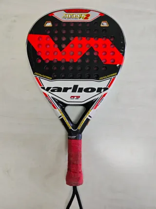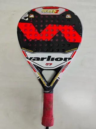 Pala de pádel Varlion Avant Carbon Ti 2. - Diseño con detalles en rojo y negro. - Marco con acabado en blanco y negro. - Grip de color rojo.