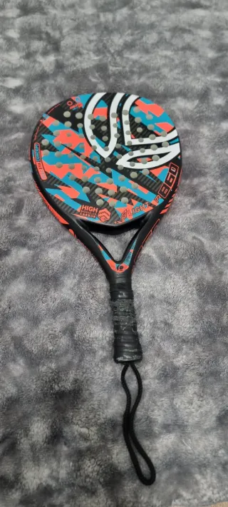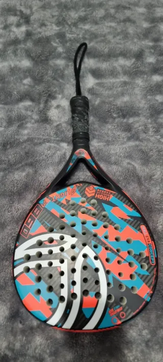 Pala de pádel con diseño moderno y llamativo. - Pala de pádel. - Material: Carbono. - Color: Negro, rojo y azul. Utilizada unas 3-4 veces.