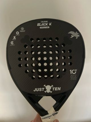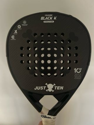 Pala de pádel Colours Black K Evolution con un diseño moderno y llamativo. - Acabado en negro mate. - Logo de JUST TEN en blanco. - Detalle 10 Years 2012-2022.