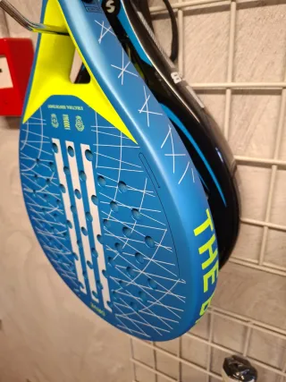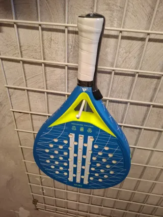 Pala de pádel Adidas Drive con un diseño llamativo en azul y amarillo. Ideal para jugadores que buscan control y potencia. - Marco con refuerzo estructural. - Superficie con agujeros para mayor aerodinámica. - Empuñadura con cinta blanca.