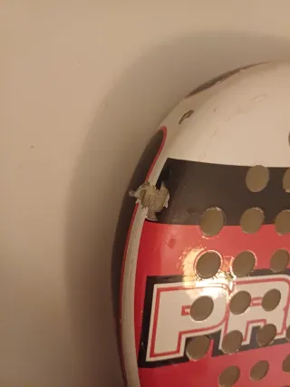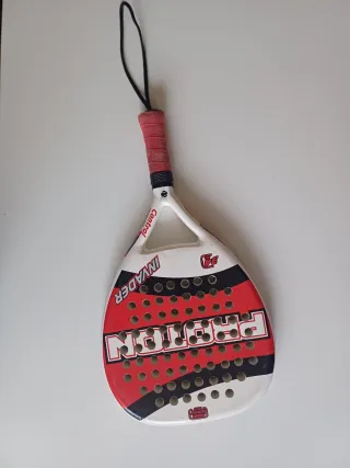 Pala de pádel con diseño llamativo en blanco, rojo y negro. - Marca: Invader - Modelo: Proton - Diseño: Control - Cordón de seguridad negro Tiene algunos rasguños. El más importante se aprecia en la foto pero no afecta al funcionamiento