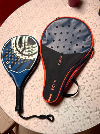 Pala de pádel marca Kuikma con su funda protectora. - Pala de pádel de color azul y blanco. - Funda de pádel de color negro y naranja. - Modelo PC 120.