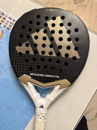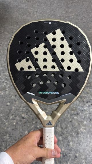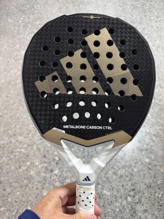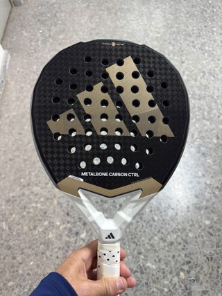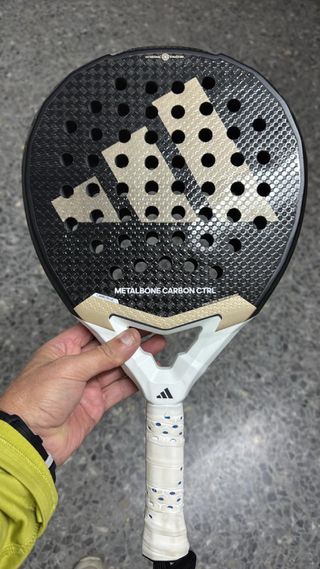 Pala de pádel Adidas Metalbone Carbon Ctrl. - Diseño en negro y dorado. - Logo de Adidas en la pala. - Grip blanco con puntos negros.