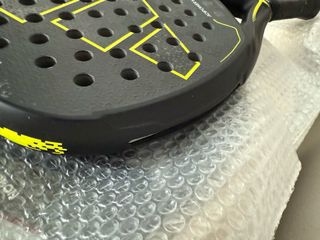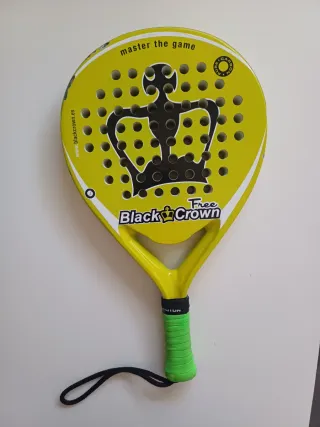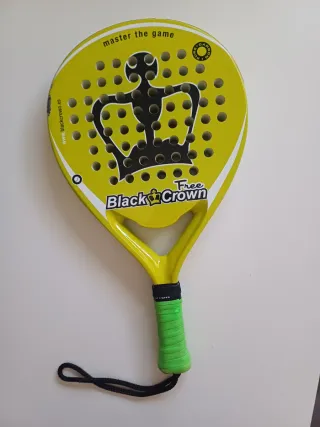 Pala de pádel de la marca Black Crown. - Color amarillo. - Diseño con corona negra. - Incluye cordón de seguridad negro. Tiene algunos defectos que se detallan en las fotos