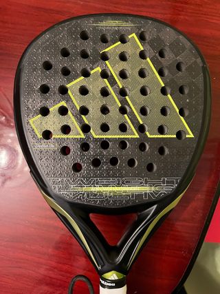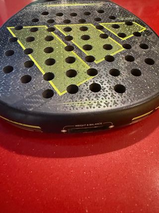 Pala de pádel Adidas Adipower Multweight con diseño moderno. - Pala de pádel. - Marca Adidas. - Modelo Adipower Multweight. - Diseño con logo de Adidas en amarillo y negro. - Superficie con agujeros. - Estructura reforzada. solamente rozadura en pintura nada que afecte a las fibras de la pala No lleva los pesos