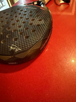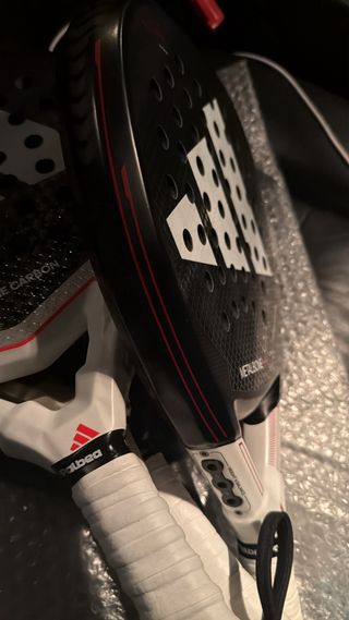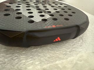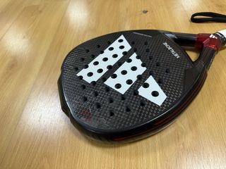 Pala de pádel Adidas en buen estado, con un diseño moderno y llamativo. - Superficie con acabado rugoso para mayor control. - Marco de carbono. - Incluye funda protectora.