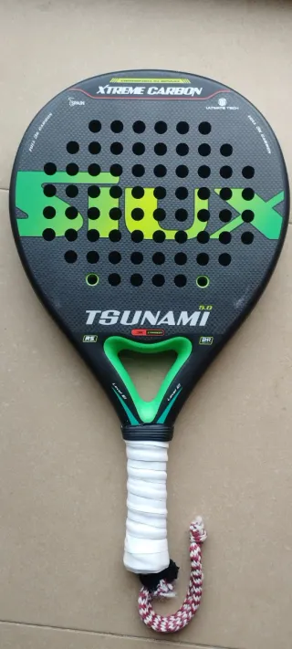 Pala de pádel Siux Tsunami 5.0 con tecnología Xtreme Carbon. Sin ninguna rotura ni salto de pintura, solo cambiada la cuerda. - Fabricada en España.