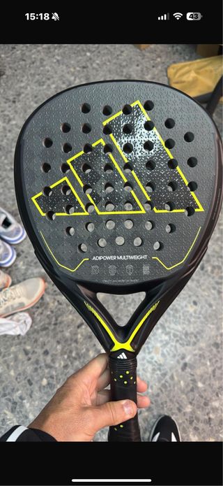 Pala de pádel Adidas Adipower Multiweight en buen estado. - Diseño en negro y amarillo. - Logo de Adidas. - Agarre negro con detalles amarillos.