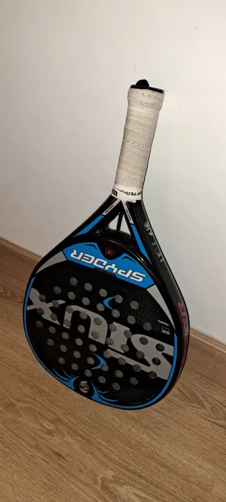 Pala de pádel SPYDER PRO con diseño moderno y llamativo Tiene una grieta - Pala de pádel SPYDER PRO. - Color negro, azul y gris. - Incluye funda.