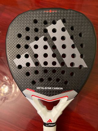 Pala de pádel Adidas Metalbone Pro en buen estado. - Diseño en negro con detalles rojos. - Logo de Adidas en blanco. - Grip blanco con logo de Palbea.
