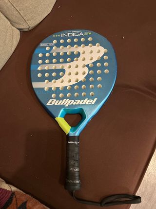 Pala de pádel Bullpadel Indica CTR en color azul. - Diseño con agujeros. - Mango negro con detalles. - Correa de seguridad. algún roce sin importancia