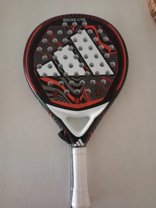 Pala de pádel Adidas Bisoke Ctrl con un diseño llamativo en negro, rojo y blanco. - Diseño con el logo de Adidas. - Nombre del modelo 'Bisoke Ctrl' en la parte superior. - Agarre blanco con precinto protector.