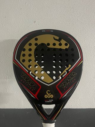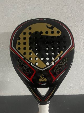 Pala de pádel Vibora Yarara Edition con diseño llamativo. tiene varios roces y una pequeña grieta en una cara , es solo la laca, nada estructural. - Marco con tecnología Total Carbon Tube. - Superficie con acabado Soft Core Carbon. - Diseño en negro, dorado y rojo.