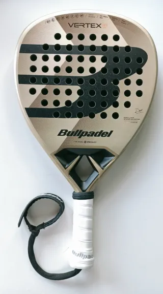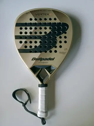 Pala de pádel Bullpadel Vertex 04 W 25. Solo se ha usado una vez. - Diseño en color dorado y negro. - Incluye correa de seguridad. - Modelo de la colección 2025.