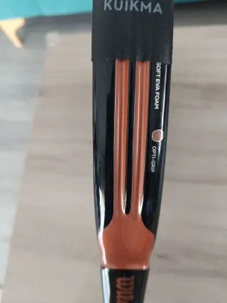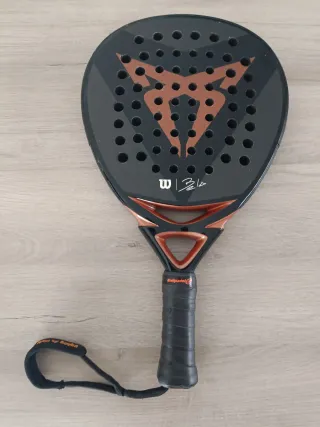 Pala de pádel Wilson Cupra V1 con muy poco uso. Apenas he jugado 5-6 partidos con ella.Precio NO negociable - Diseño moderno en negro y cobre. - Logo de Cupra en la cara. - Firma de jugador en la cara. - Correa de seguridad en el puño. - Pala muy equilibrada con buena salida de bola y excelente control