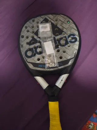 Pala de pádel Adidas Metal Control con un diseño moderno y llamativo. - Superficie con acabado texturizado. - Logo de Adidas en grande. - Empuñadura amarilla. - Incluye pequeños pesos para balance. Sin roturas en las caras y sin roturas en el marco. Roces leves por su uso, pefecto estado para su funcionamiento