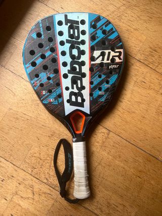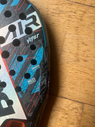 Pala de pádel Babolat Air Viper del año 2023. Diseñada con un acabado moderno y llamativo. - Superficie con relieve para mayor control. - Marco de carbono. - Empuñadura cómoda. Esta muy dañada como se puede ver en las fotos.
