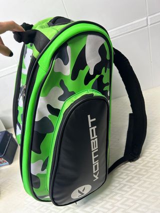 Paletero kombat verde es grande tiene dos apartados para poner palas, dos bolsillos mas pequeños y uno para poner las zapatillas tiene algun rasguños