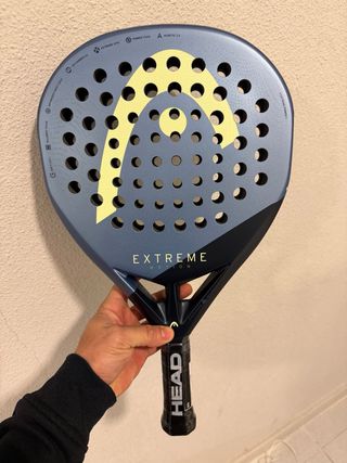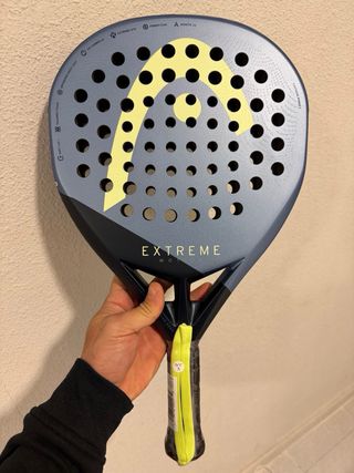 Pala de pádel Head Extreme Motion con un diseño moderno y llamativo. - Color gris con detalles en amarillo. - Logo de Head en el puño.
