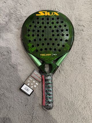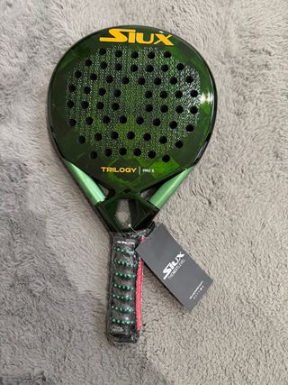 Pala de pádel Siux Trilogy Pro 5 con un diseño moderno y llamativo. - Acabado en color verde con detalles camuflados. - Logo de Siux en amarillo en la parte superior. - Nombre del modelo 'Trilogy Pro 5' en la cara. - Grip negro con puntos verdes y detalles rojos.