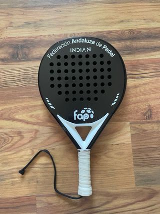 Pala de pádel con diseño en negro y blanco. - Logo de fap en blanco. - Inscripción Federación Andaluza de Padel en blanco. - Modelo INDIAN en blanco. posibilidad de incluirse en el envio una funda de pala, y grips precio negociable