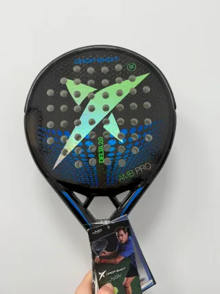 Pala de pádel Drop Shot Delta 2.0 AMB Pro. - Diseño con acabado en carbono. - Detalles en azul y verde iridiscente. - Incluye etiqueta original.