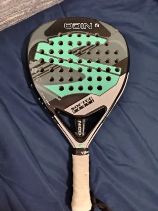 Pala de pádel Softee Odin con diseño llamativo. - Color gris, negro y verde menta. - Una cara en perfecto estado la otra con golpe, ver en foto