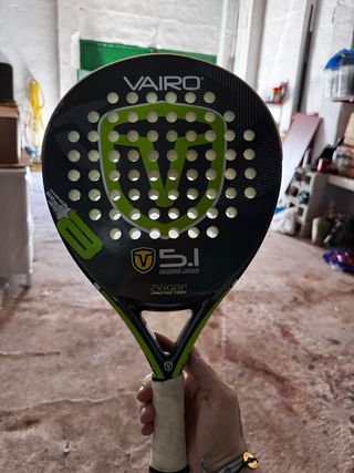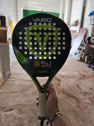 Pala de pádel Vairo 5.1 con un diseño moderno y llamativo. - Pala de pádel Vairo. - Modelo 5.1. - Diseño en negro y verde. Tiene un pequeño golpe en el filo, se ve en una foto, regalo funda y un grid.