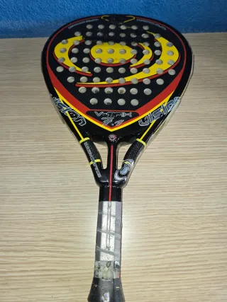 Pala de pádel Vision V-MAX 7.1 con diseño llamativo en negro, amarillo y rojo. Ideal para jugadores que buscan control y potencia. ¡¡¡Pala tope de gama reparada!! - Marco negro con detalles en amarillo y rojo. - Superficie con agujeros para mejorar la aerodinámica. - Empuñadura con cordón de seguridad.