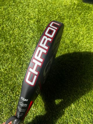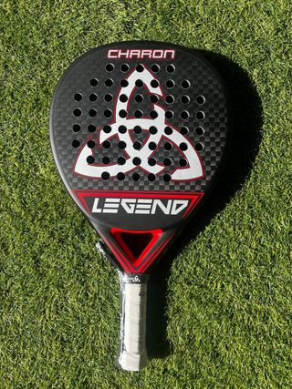 Pala de pádel de la marca Legend, modelo Charon. - Diseño con acabado en carbono. - Negro con detalles blanco y rojo. - Puño con protector de plástico