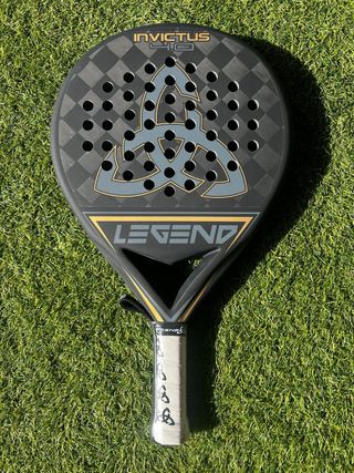Pala de pádel Invictus Legend 4.0 con diseño moderno y acabado en carbono. - Diseño con patrón de rombos. - Detalles en gris y dorado. - Puño con plástico puesto.