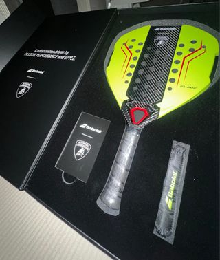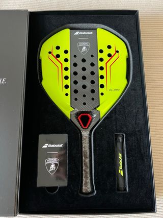 Pala de pádel Babolat x Lamborghini, modelo BL002. Presentada en su caja original. - Diseño llamativo en color amarillo neón. - Detalles en rojo y carbono. - Incluye funda protectora y tarjeta de autenticidad.
