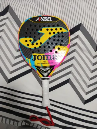 Pala de pádel Joma Tournament Pro, edición especial A1padel. Diseño llamativo con detalles en amarillo, rosa y azul. - Superficie con acabado mate. - Marco de carbono. - Empuñadura blanca. Cambio por Joma gold pro en el mismo estado.