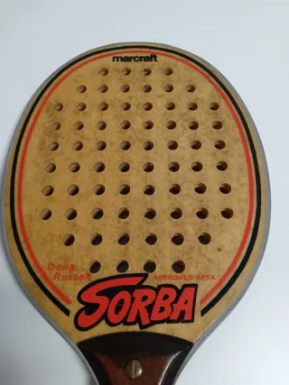 Pala de pádel vintage Marcraft modelo Sorba, diseñada por Doug Russell. Un artículo de colección con un diseño clásico. - Pala de madera. - Logo Sorba en rojo. - Detalle de marcraft en la parte superior. - Empuñadura de cuero marrón.