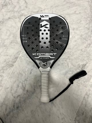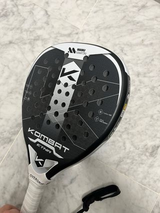Pala de pádel Kombat Etna de Manu Martín, modelo 2025. Usada solo en un partido. - Diseño moderno en negro y blanco. - Logo de Manu Martín. - Superficie con puntos. - Empuñadura blanca.