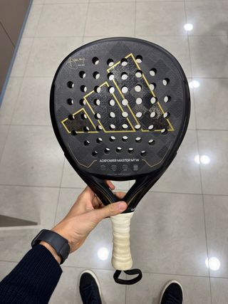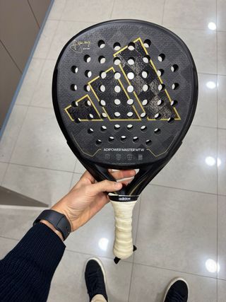 Pala de pádel Adidas Adipower Master MTW con diseño en negro y detalles dorados. Tiene un lee roce de pintura. usada 3 veces - Firma de Alex Ruiz. - Logo de Adidas. - Modelo Adipower Master MTW.