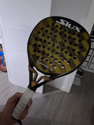 Pala de pádel Siux Electra ST3 Pro. En perfecto estado. - Diseño en negro y amarillo. - Logo de Siux en amarillo. - Firma en la cara. - Agarre blanco.