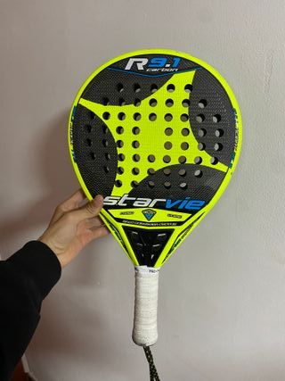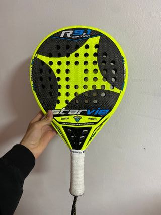 Pala de pádel StarVie R9.1 Carbon con un diseño llamativo en amarillo y negro. Tiene 5 meses de uso me toco en un sorteo y la he estado usando para dar clases de padel. Tal y como se ve en las fotos Hago envíos - Pala de pádel StarVie. - Modelo R9.1 Carbon. - Color principal amarillo con detalles en negro y azul.