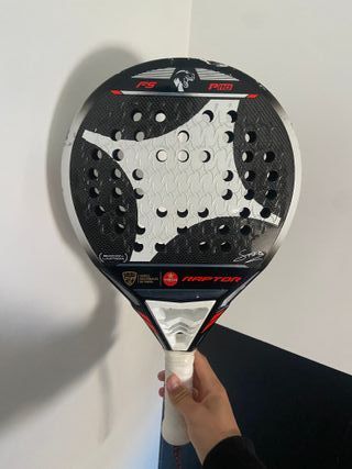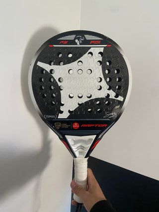 Pala de pádel StarVie modelo Raptor. Se compro hace 1 año y se ha usado para dar clases de padel, con marcas de uso y un comienzo de una grieta que no se del todo si es o no,se puede mandar fotos y vídeos sin problema Hago envíos - Diseño con acabado en negro y blanco. - Detalles en rojo y plateado. - Incluye funda.