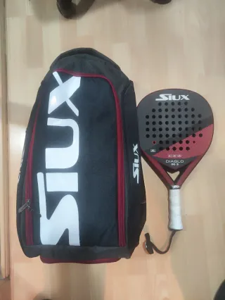 Pack de pádel que incluye una pala y un paletero de la marca Siux. Vendo por no usar. 365 g La Siux Diablo Go 3 es una pala de pádel pensada para jugadores intermedios que buscan un equilibrio perfecto entre potencia y control. Su forma híbrida y balance medio hacen que se adapte perfectamente a todo tipo de juegos, permitiendo transiciones rápidas entre defensa y ataque. Con una superficie de carbono 3K y un tacto medio, ofrece una excelente sensación y precisión en cada golpe, asegurando un rendimiento constante en cualquier situación. Paletero Siux Pro Tour con todo tipos de almacenamiento para objeto personales, zapatillas y p