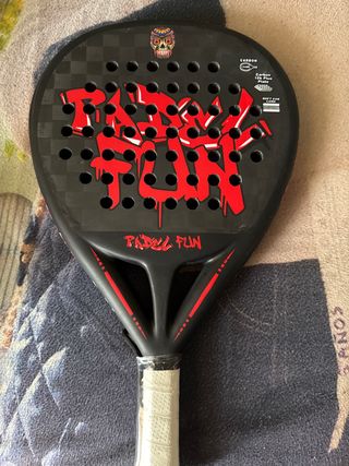 Pala de pádel Padel Fun con un diseño llamativo. - Pala de pádel negra. - Diseño con calavera y letras rojas. - Marco y caras de carbono.