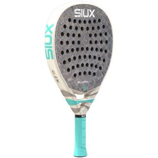 Pala de pádel Siux Valkiria Pro con acabado en carbono y detalles en turquesa. Diseñada para un juego avanzado. - Superficie de carbono. - Marco resistente. - Grip cómodo.