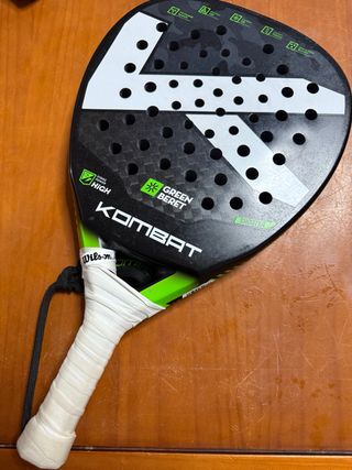 Pala de pádel Kombat Green Beret, modelo Shooter. Lo saltado es por quitarle el protector - Diseño con acabado en carbono y detalles en blanco. - Agarre con tecnología Powergrip. - Logo de Wilson Pro. Tiene radpados del juego y jn pequeño golpe en un canto