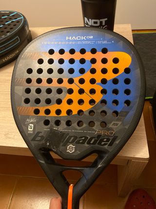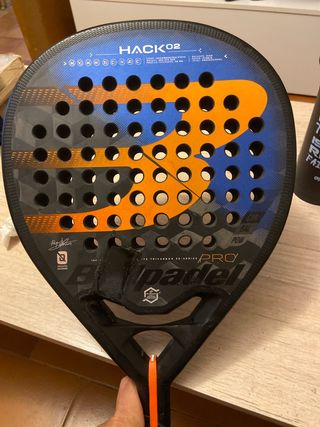 Pala de pádel modelo Hack 03, diseñada en colaboración con Paquito Navarro. Presenta un diseño distintivo y materiales de calidad. - Forma lágrima. - Balance medio-alto. - Goma Black Eva. - Pequeños roces que no afectan en su uso. - Funda y bote de pelotas incluida marca decathlon sin abrir.