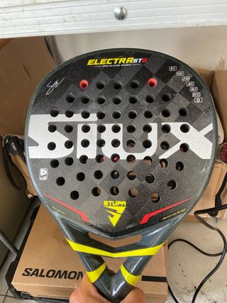 Pala de pádel Siux Electra ST2 en buen estado, aunque con una pequeña reparación visible en una de las imágenes. - Modelo: Siux Electra ST2 Pro Player Series. - Presenta signos de uso. - Incluye una pala.