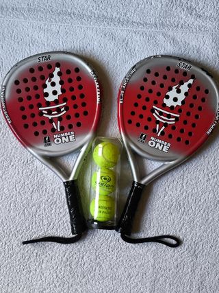Se vende juego de dos palas de pádel con un bote de tres pelotas. Palas con diseño Star y Number One. Marco de Kevlar y carbono. Incluye 3 pelotas de pádel. Ideal para iniciarse en el pádel. Señales de uso normal, no rotas, no sucias. Aún tienen larga vida para jugar. Precio por todo: 30 € Hago envíos.