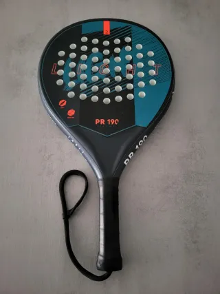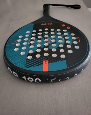 Pala de pádel Kuikma PR 190 en color negro y azul. - Diseño con agujeros en la cara. - Incluye correa de seguridad en el puño. - Modelo PR 190 LIGHT.